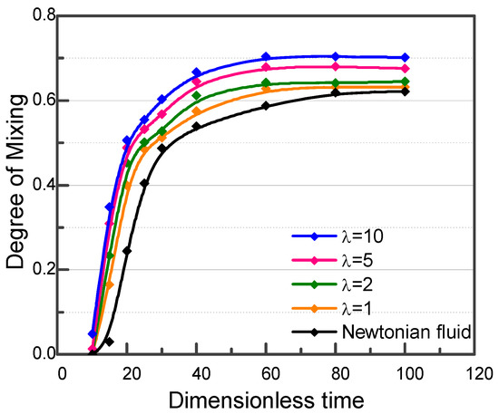 where A and f are the amplitude and frequency of the modulating signal, respectively. A, f, and P are all dimensionless. A was set at 0.8 to ensure a large pressure modulation while keeping the absolute pressure positive during the driving process. f was set at 1. P0 was the same as that in the constant pressure case, 3500. The change in the degree of mixing in cross-section S within one period was studied when pressures in Equation (21) were applied to the viscoelastic fluid case. Under the above driving pressure, the concentration distributions at t = 120 in the Newtonian fluid and viscoelastic fluid cases are shown in Figure 5, respectively. The transition region between the blue (low concentration) and red (high concentration) fluids expanded significantly when the pressure was modulated compared to when the pressure was constant, indicating that pressure modulation greatly improves mixing efficiency. Meanwhile, the concentrations in the converging channel were no longer uniformly distributed along the channel due to the pressure changes over time. At times P1 < P2, higher concentration fluid from inlet I2 will enter the converging channel. The converse happens when P1 > P2. In other words, the two fluids will alternatively enter the mixing channel in larger amounts. Due to the large width of the subsequent expanded channel, the small amounts of fluids introduced during one pressure cycle will start to expand and convect with each other. In this way, better mixing can be realized. In addition, we can also see that the larger discontinuous portion of fluid alternated more in the converging channel for the viscoelastic fluid case compared to the Newtonian fluid case, which indicates a higher mixing efficiency in the viscoelastic fluid. This was confirmed by investigating the degree of mixing at the cross-section S for both fluids. Figure 6 compares the mixing of a viscoelastic fluid with a different relaxation time and a Newtonian fluid. Mixing increased with the relaxation time and became stable at t = 80 for all fluids. The Newtonian fluid had the lowest degree of mixing of 0.62. Mixing gradually increased from 0.63 to 0.70 as the relaxation time λ increased from 1 to 10. This is because a higher relaxation time indicates a larger elastic stress, which leads to more convection in the fluid. Compared to the condition of constant pressure, the degree of mixing increased from 0.15 to 0.61 for the Newtonian fluid case under modulated pressure and from 0.25 to 0.68 for a viscoelastic fluid with λ of 5.