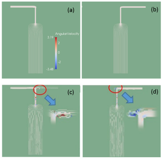 Streamlines and angular velocity in the Newtonian fluid case (a,c) and viscoelastic fluid case (b,d) under modulated pressure at the inlet I1 and constant pressure at the inlet I2.