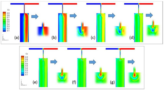 Concentration distribution in viscoelastic fluid case under modulated pressure at both inlets with phase difference (a) 0, (b) π/6, (c) π/3, (d) π/2, (e) 2π/3, (f) 5π/6, and (g) π.
