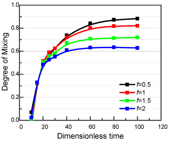 At a higher frequencies, less fluid will enter the converged channel during each period. As shown in Figure 10a,b, the component mixing maps are compared for the viscoelastic fluid case when f = 1 and f = 1.5, respectively, with fixed parameters A = 3500 and Δφ = π. The green region shrinks significantly when f increases from 1 to 1.5. In addition, larger regions of unmixed fluid occupy the left and right sides of the expanded channel. This indicates that a higher modulating frequency undermines the mixing effect. This can be better understood by looking at the concentration distributions in the inlets and in the converging channel. At time t = 120, the pressure at inlet I2 is higher than that at inlet I1, and more of the red fluid will be injected. At a lower modulating frequency, the difference in the amount of fluid flowing into the converging channel from each side is larger in each cycle; this can be observed in the converging channel and results in a higher mixing efficiency overall. The final degrees of mixing, which increase from 0.61 to 0.90 as the pressure oscillation frequency decreases from f = 2 to f = 0.5, are shown in Figure 11.