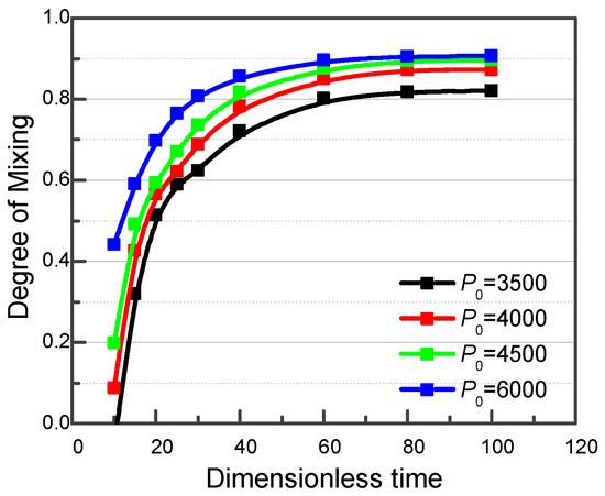 In addition, we can also increase the degree of mixing by increasing the alternating volume within one cycle using a higher pressure level at the inlets. To do this, P0 in Equation (22) is varied between 3500 to 6000 while setting f = 1 and Δφ = π. By increasing P0, the final degree of mixing in the viscoelastic fluid case also increases from 0.82 to 0.91, as shown in Figure 12.