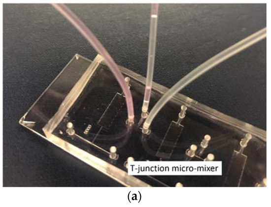 To validate the results of the simulations, the mixing efficiency was experimentally studied here in a PDMS-glass bonded microfluidic chip, as shown in Figure 13a. A mold for the PDMS structure was fabricated from SU8 photoresist on a silicon wafer using a standard photolithography process. The PDMS is a mixture of base and crosslinker with a ratio of 10:1. It was poured on the SU8 mold and cured at 65 °C for 4 h. To complete the chip, the cured PDMS was bonded to a glass slide after oxygen plasma treatment. The size of the microchannel was scaled to 100 µm based on the model in Figure 1. The length and width of the inlet channel were L0 = 2 mm and W0 = 100 µm, respectively. The converging channel was L1 = 600 µm in length and W1 = 50 µm in width. The mixing channel was L2 = 2 mm in length and W2 = 600 µm in width. The entire micromixer structure had a depth of d = 100 µm, and the outlet was directly at the end of the mixing channel.