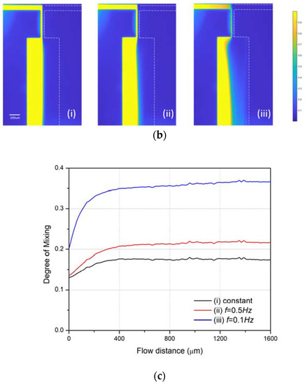 A Newtonian glycerol solution was injected into the two inlets of the T-junction mixer. The fluid at one inlet contained 10 µg/mL of Rhodamine B, while the other did not, so the mixing degree could be determined by quantifying the Rhodamine B concentration. With the limit of one programmable pump (PHD ULTRATM 4400), we fixed the flow rate at 500 µL/h on one inlet, and modulated the flow rate on the other side under three different conditions: (i) Constant flow rate of 500 µL/h; (ii) alternating flow rate between 0 and 1000 µL/h at a frequency f = 0.5 Hz and duty cycle of 50%; (iii) alternating flow rate between 0 and 1000 µL/h at a frequency f = 0.1 Hz and duty cycle of 50%. The recorded flow pattern is shown in Figure 13b. The color map represents the Rhodamine B concentration, which is normalized from 0 to 1: Yellow denotes a concentration of 1 and blue, a concentration of 0. For case (i), the flow rates at both inlets were the same constant value and the mixing region was narrow, indicating a small degree of mixing. For case (ii), the mixing region was increased when the flow rate on one side alternated at f = 0.5 Hz. The mixing region was further increased when the frequency decreased to 0.1 Hz in case (iii). According to the normalized concentrations of Rhodamine B, the degree of mixing at different flow distances along the channel is calculated using Equation (20) and plotted in Figure 13c. The origin indicates the point at which the fluid enters the mixing channel. The degree of mixing gradually increases with the flow distance, and stabilizes at 0.20 for case (i), 0.25 for case (ii), and 0.37 for case (iii). This experimentally demonstrates the enhancement in mixing when the flow is modulated on one side compared to having a constant driving flow at both sides, which agrees well with the simulation results. This also confirms that mixing is increased as the alternating frequency decreases.