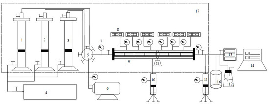Schematic diagram of the experimental setup (1. Intermediate container (high purity CH4), 2. Intermediate container (simulated water), 3. Intermediate container (high purity CO2), 4. Pump, 5. Sluice with five gates, 6. Vacuum pump, 7. Pressure gage, 8. Electronic pressure gauge, 9. The long-core, 10. Confining pressure pump, 11. Back pressure pump, 12. Conical flask, 13. Electronic pressure gauge, 14. Chromatographic analyzer, 15. Angle regulator of core, 16. Beaker, 17. Thermostat box).