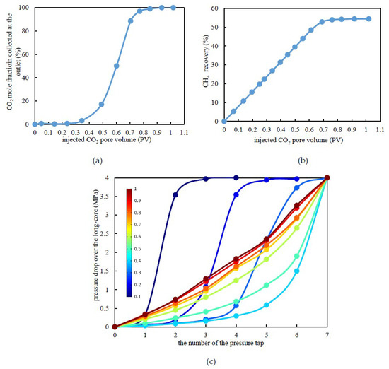 According to Figure 2a, as the pore volume (PV) of the injected CO2 increased to 0.4 PV, a current of CO2 was detected at the outlet, which indicated that displacement front breakthrough had occurred. Following this, the CO2 mole fraction collected at the outlet increased almost linearly with the pore volume of the injected CO2 until it reached 0.7 PV. When it reached approximately 0.8 PV, almost no CH4 was detected at the outlet, which indicates that the CH4 recovery had reached its maximum. It can be clearly observed from Figure 2c that the pressure drop was mainly diminished at the displacement leading edge. Before breakthrough of the leading edge, the higher the pore volume of the injected CO2, the further the pressure propagation, and, for the same pressure test point, the pressure drop decreased. As the injected CO2 reached 0.4 PV, breakthrough occurred at the displacement leading edge. Subsequently, with the increase in the pore volume of injected CO2, the distribution of the pressure drop was more uniform over the whole long-core. With the formation of continuous flow channels, the pressure drop tended to be stable. When the injected CO2 pore volume was 1.0 PV, the pressure drop curve was close to linear.