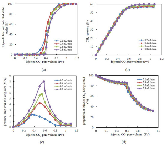 In order to determine the effect of the injection rate on EGR and CO2 storage efficiency, four groups of experiments were conducted using injection rates of 0.2, 0.4, 0.6, and 0.8 mL/min, respectively. The experimental results are presented in Figure 3.