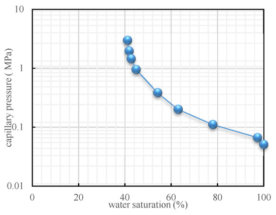 The effect of the injection rate on the results of CO2 flooding CH4 can be interpreted by comparing the viscous pressure drop generated by the flow and the capillary pressure. Therefore, we conducted an experiment using the semipermeable plate method to measure the capillary force [25] and then we measured the correlation of the capillary force with water saturation. First, the core was saturated with water. Then the displacement pressure difference between the two ends was established by using vacuum extraction. This pressure difference is balanced with a certain capillary force and different displacement pressure differences correspond to different capillary forces. Under a displacement pressure difference, the non-wet phase fluid (gas) displaces the wet phase fluid (the formation water) in the core. Therefore, the saturation of the wet phase (water) decreases as the displacement pressure difference increases. According to the displacement pressure balanced with the capillary pressure and the corresponding wet phase (water) saturation in the core during the displacement process, the correlation of the capillary force with the wet phase (water) saturation can be obtained. According to the research of Zou et al. [26,27], for a tight sandstone gas core, a hydrophilic semipermeable plate with a threshold pressure of 3 MPa should be selected. Thus, after the wet phase fluid saturates the semipermeable plate, the wet phase fluid can only pass through the semipermeable plate as a result of the capillary pressure until the displacement pressure is not less than the threshold pressure of the semipermeable plate. It is worth noting that the equilibration time should exceed 72 h for each pressure point.