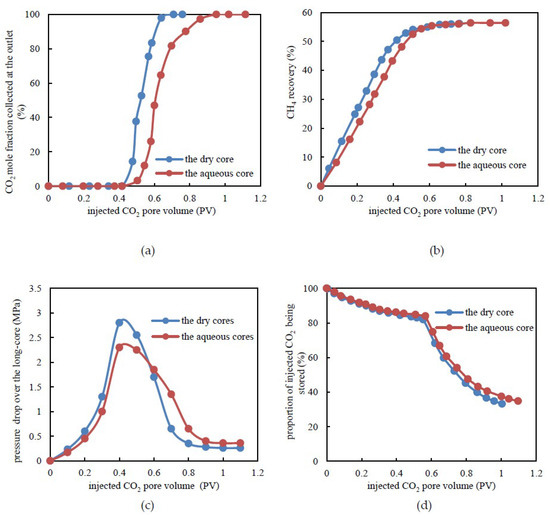 The results demonstrated that the displacement front broke through when the injected CO2 pore volume was 0.4 PV for the dry long-core while it was up to 0.5 PV for the aqueous core (Figure 5a). For the former, when the injected CO2 was 0.76 PV, the CO2 mole fraction collected at the outlet was 100% and no more CH4 was displaced. For the latter, this situation did not occur until the injected CO2 was 0.95 PV. Due to the presence of water, a portion of injected CO2 initially dissolved and formed unstable carbonic acid in the water. In the same area, when the carbonic acid was saturated in the aqueous solution, CO2 began to displace CH4. Consequently, leading edge breakthrough occurred slightly later in time for the aqueous long-core with CO2 flooding. When the CO2 leading edge broke through, the CH4 recovery was 48.78% and 52.48%, which corresponds to the dry long-core and the aqueous core. However, at the end of displacement, the corresponding CH4 recovery was 54.68% and 56.23%, respectively (Figure 5b). In previous studies [28], it was shown that, due to the strong adsorption capacity of the tight sandstone rock surface, a tiny fraction of pores and throats might be blocked by water. Consequently, CH4 exists in relatively larger-sized pores and throats, so it is more easily displaced. The amount of gas in this part was quite limited. Therefore, CO2-EGR for the aqueous long-core was slightly enhanced when compared to the dry long-core.