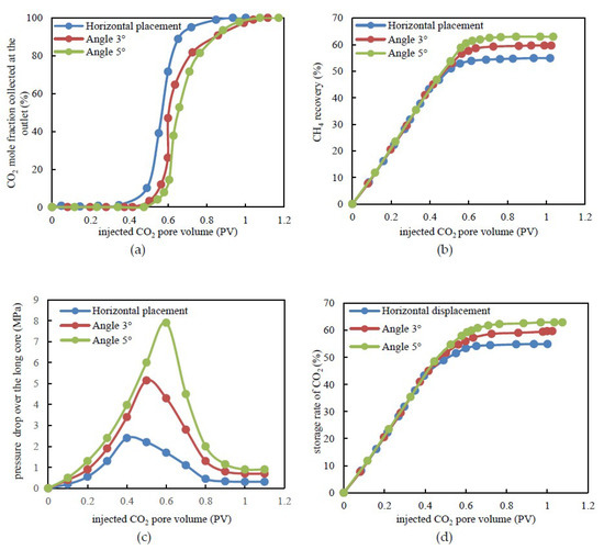 The results demonstrated that the displacement front breakthrough occurred when the injected CO2 pore volume was 0.37, 0.51, and 0.60 PV, which corresponds to the horizontally placed long-core and dip angles of 3° and 5°, respectively (Figure 6a). The higher the dip angle, the longer the miscible band and the later CO2 breakthrough occurred. Since the stage before CH4 breakthrough is an important period for CO2 storage, such experimental results indicated that the CO2 storage rate could be increased by at least around 1.5 times at this stage for a tight sandstone gas reservoir even with a small dip angle. When the CO2 leading edge broke through, the CO2 recovery was 40.49%, 53.03%, and 59.06%, which corresponds to the horizontally placed long-core and dip angles of 3° and 5°, respectively (Figure 6b). In addition, at the end of displacement, the corresponding CH4 recovery was 54.49%, 59.65%, and 62.95%, respectively. Due to the higher density of supercritical CO2, it was easier for CH4 to move from the bottom to the higher part. Moreover, the gravitational differentiation between CO2 and CH4 limited the mixing of gases in the vertical direction, which was beneficial to the displacement. Furthermore, as the viscosity of supercritical CO2 was higher when compared to CH4, a favorable mobility ratio could improve the displacement stability. An additional 5% to 8% recovery of CH4 could be achieved when compared to the horizontally placed long-core due to the dip angles (Figure 6b).