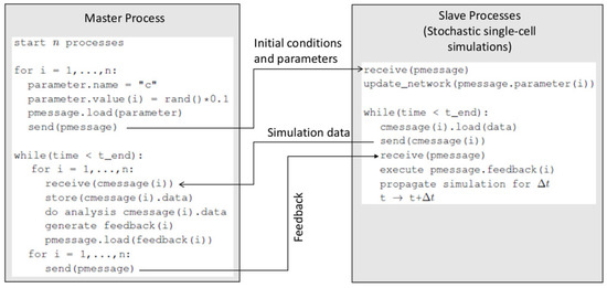 The framework works as a server (a master process), while each of the parallel simulations on the biochemical network model serves as a client (a slave process). MPI is used to mediate the server-client communications. A detailed algorithm of this server-client scheme is provided in Supplementary Materials (S1_File.pdf). This sever-client scheme is illustrated in Figure 2. Each cell object (slave process) is allowed to propagate simulation (Gillespie algorithm on the intracellular network) for a prescribed time interval . At the end of each , the master process and the slave processes communicate. The master process collects simulation data from each slave process (cell object) and analyzes the data against the rules (Type 2 and Type 3 inputs). Based on the analysis, it sends cell-specific instructions to each slave process using MPI. In addition, it takes actions to execute death, division, or other functions for a cell object if corresponding conditions specified in the rules are met.
