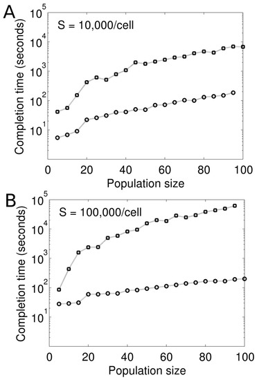 Computational performance of Model I. Model I (circles) and its equivalent sequential model (squares) are simulated for 1000 s. The two panels correspond to different initial concentration of molecule S in the model, as shown. The x-axis represents the average cell population size in a simulation. The y-axis represents corresponding simulation completion time (clock seconds). Simulations are performed in a dedicated 20-core machine.