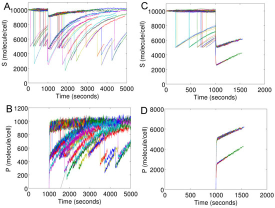 Temporal evolution of S and P in individual cells. (A,B) the population is stimulated at s with ; (C,D) the population is stimulated at s with .
