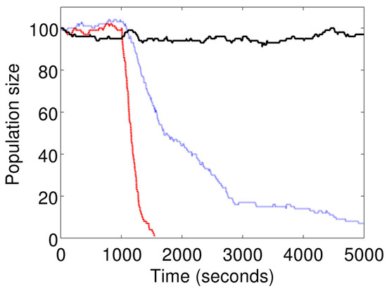 Cell population dynamics at different doses of stimulation, indicated by black ( s), blue ( s), and red ( s), respectively.