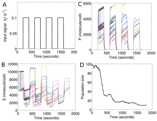 The rate of cell death in Model I is linked to the intracellular concentration of P (activated S) by a linear function, as discussed in the Method section. Figure 5 shows intracellular S and P of individual cells in an evolving cell population. We launch an initial population of 100 cells (parallel processes) at time zero. At s, the population is stimulated with s (Figure 5A,B) and s (Figure 5C,D).