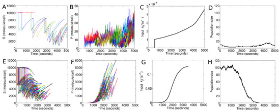 Figure 8 shows the population response in Model II. In the top panels (Figure 8A–D), an initial population of 10 cells are launched at time zero, and stimulated at s with a small dose of the extracellular signal, s. The population remains non-responsive to this signal. The average population size is not affected, as seen in Figure 8D. In the bottom panels (Figure 8E–H), an initial population of 100 cells are launched and subjected to the same level of stimulation, s, at s. Except for the population size, all other conditions are identical to those in the top panels. Nevertheless, contrary to the smaller population, this larger population displays a dramatic response (Figure 8E,F). The quorum-sensing positive feedback is triggered because of the collective contribution of the population. This leads to a rapid buildup of intracellular P (Figure 8F) and extracellular I (Figure 8G). As a result, the population shows a rapid post-stimulation decay (Figure 8H).