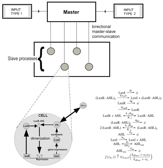 In the master-slave scheme of our framework (Figure 9), the biochemical reactions in each cell is independently simulated using the Gillespie algorithm for a short interval . Each cell object simulates the Gillespie algorithm based on the reactions shown in Figure 9. The updated intracellular species concentrations from each cell object (slave process) are sent back to the master process using MPI. The master process then updates the common (well-mixed) extracellular environment based on the rules specified as an input to the master process (Figure 9). Here, the master takes two types of inputs. Type 1 input describes the distribution of parameters to incorporate cellular heterogeneity and type 2 input is the relationship between cell and environment defined as the net change between external autoinducer concentration () and internal autoinducer concentration (AHL) over each time interval . The parameters values associated with this model are taken from [8].