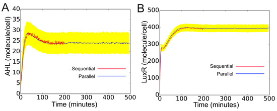 Prediction accuracy of the framework-created quorum sensing model is validated against an equivalent sequential model. Temporal evolution of (A) and (B) LuxR. The blue and red curves represent the parallel model and the sequential model, respectively. The yellow region is the standard deviation, representing cell-to-cell variability arising from distribution of parameters. The temporal profiles of these concentrations are similar to those shown in [8]. Note that the sequential model was run only up to 200 s due to the prohibitively slow computation.