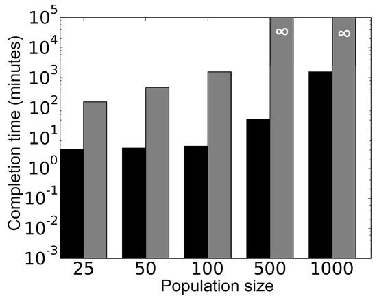 Semi-log plot for computational performance of the parallel quorum sensing model compared against a corresponding accurate (sequential) model. The black and grey bars represent the parallel and the sequential model, respectively. The infinite signs represent the cases where simulation of the sequential model remained unfinished after 168 h of simulation.