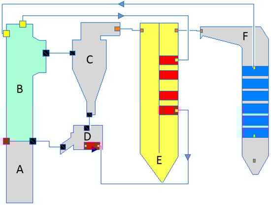 Object-oriented approach, CFB (Circulating fluidized bed) in Dymola, boiler bed and riser (A,B), cyclone (C), hot solid re-circulation via SH3 in the loop-seal (D), SH1 and SH2 (E), and the economizer (F).