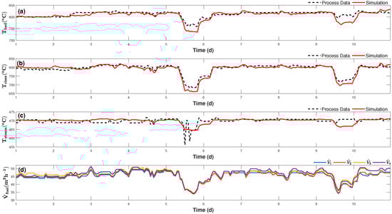 Simulation and actual temperature profiles for the boiler bed (a); riser (b); steam (c); and the volumetric flow rate measurement for the four fuel feeders (d).