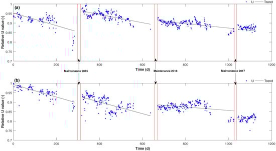 Normalized overall heat transfer coefficient for the evaporator (a) and SH3 (b) at full load. The red lines indicate the duration of maintenance.