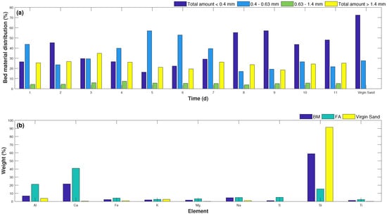 The percent in size distributions for the measured bed material (a), and the average percent composition of bed material (BM) and fly ash (FA), in comparison to virgin sand (b).