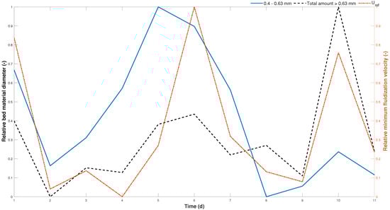 It can be observed that there is a large change, from day-to-day, when compared to virgin sand. A sample of virgin sand shows that it primarily consists of particles less than 0.4 mm. From the model’s prediction of the minimum fluidization, a correlation between and agglomeration has been detected and is illustrated in Figure 6. From day one, it can be observed that there is a good correlation between the particle size decreasing along with a reduction in the minimum fluidization. The size of the bed material particles sampled then begin to increase along with an increase in minimum fluidization up to days 4 and 5, where both proceed to decrease and increase in similar trends up to day 11. Since roughly three quarters of the virgin sand is comprised of having a diameter of less than 0.4 mm, the change in particle size diameter between 0.4 and 0.63 mm was observed. The idea is that agglomeration has occurred when the size distribution has increased above 0.4 mm due to the binding of bed material. It was also discovered that recirculated fines greater than 0.63 mm correlate to . In comparing Figure 5a to the models prediction of , Figure 6, there is a noticeable trend between agglomeration and increased . This is because, as there is an increase in the particle size of the bed material, there is also an accompanied increase in the boiler’s velocity in order to achieve an adequate level fluidization. Further analysis on the samples taken, illustrated in Figure 5b, shows that the major elemental components that lead to agglomeration have a significant presence in the bed material and fly ash. For reference, the percent composition distribution in virgin sand is presented, which is comprised of 91% Si. The bed material shows a significant increase in the content of Ca and Na and over 60% of the fly ash is composed of Ca and Al, which are heavy proponents of agglomeration.