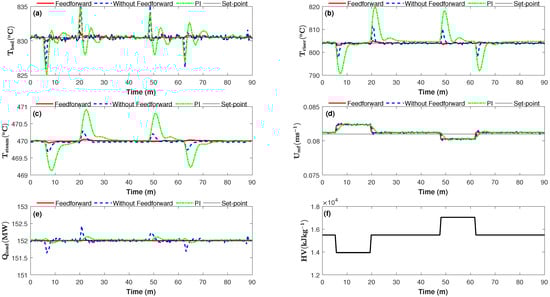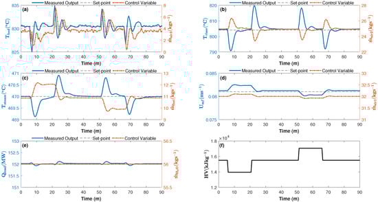Measured output response to a step change in the fuel’s heating value (f) to the bed temperature (a); riser temperature (b); steam temperature (c); minimum fluidization (d); and load (e). The figures represent feedforward and without feedforward MPC control, with reference PI control, and corresponding set-points.
