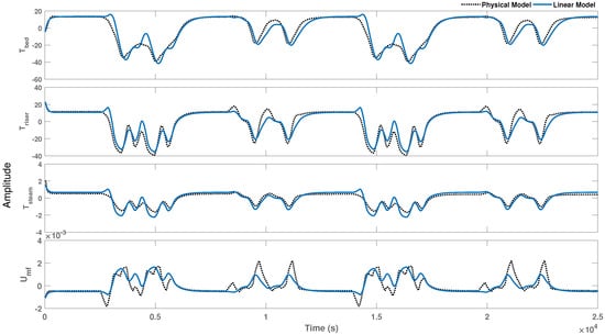 It was essential to first generate adequate input signals of a sufficient excitation in both amplitude and frequency for the control variables, which do not cause the measured output signals to deviate too far from normal operating conditions []. Ten sets of input signals were generated, and sequentially each data set was used as input into the physical model to acquire the outputs. The next step was to detrend the data by removing the mean values to eliminate any bias in the trend. N4SID was then used to create the state-space model, where several model orders were tested and it was determined that a second order model provided sufficient results, illustrated in Figure 8.