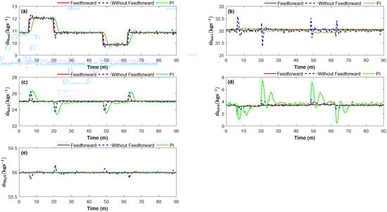 Control variable responses for the fuel mass flow (a); primary air flow (b); secondary air flow (c); tertiary air flow (d); and feed water flow rate (e). Illustrating feedforward and without feedforward MPC (model predictive control), with reference PI control.