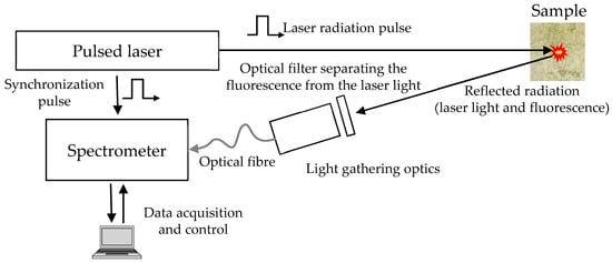 A typical setup used for LIF measurements is shown in Figure 1. Fluorescence is excited by a pulsed laser with a pulse duration of several nanoseconds. The most commonly used source is an Nd:YAG Q-switched solid-state laser emitting at the wavelength of 355 or 532 nm (correspondingly, in the frequency-tripled or -doubled mode): it combines robustness and low fabrication and maintenance costs with high electrical-to-optical power efficiency and significant quantum yield. The freshly emitted laser pulse irradiates the sample and excites the fluorescence emission. A part of this emission is collected by light-gathering optics, which can easily be developed based on off-the-shelf low-cost collimators (e.g., several F810SMA collimation packages, optimized for specific but rather wide wavelength regions []). To prevent backscattered laser radiation from entering the collimator and saturating or damaging the spectrometer, a longpass filter, with a cut-off wavelength slightly larger than the operating wavelength of the laser, is introduced into the optical path, in front of the front light-gathering lens. The collected and collimated radiation is transferred to a computer-controlled spectrometer.