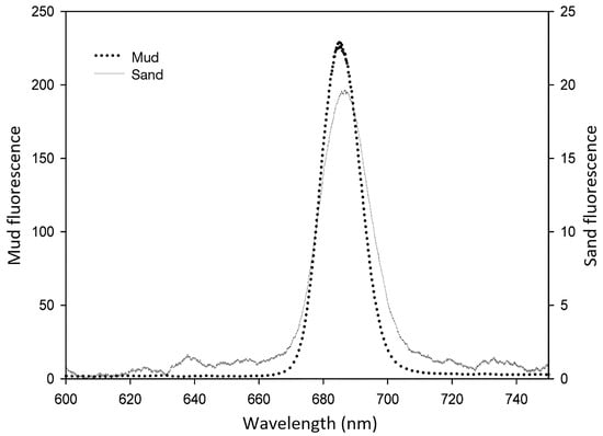 On the contrary, LIF has been successfully used in medium- and long-range remote sensing of vegetation [,,]. More recently, LIFT (laser-induced fluorescence transients) have been measured using devices able to operate at a distance reaching 50 m from the sample [,,]. The application of LIF to photosynthetic biofilms, however, has been less common. To our knowledge, in its first application to MPB, LIF has been used as a remote sensing technique to study the MPB biomass at the intertidal mudflats of the Tagus estuary, in Portugal [,,]. The authors succeed in using LIF to estimate MPB biomass and, in the case of epipelic communities, where diatoms show vertical migrations due to diel and tidal cycles and high irradiances, diatom movement was also successfully tracked. Figure 2 shows typical LIF spectra of MPB in mud and sand intertidal sediments.