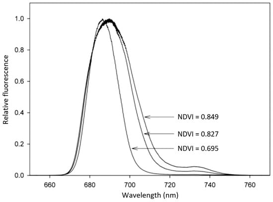 Relative fluorescence spectra of three samples of microphytobenthos (MPB) with different biomass in mud intertidal sediments (one sample with low biomass and two with high biomass). The normalized difference vegetation index (NDVI) is presented for the three samples (reprinted from Vieira [] with permission).