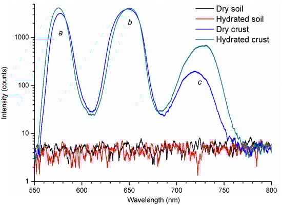 Figure 4 demonstrates the first (to the best of our knowledge) LIF spectra obtained from biological soil crusts, which markedly differ from the MPB spectra. In contrast to MPB, BSC present two main fluorescence peaks, one around 570 nm (a), the other around 650 nm (b), and a secondary peak around 720 nm (c). Slight deviations of peaks’ maxima occur between dry and hydrated crusts, but the main difference between them is in the intensity of the peaks. Bare soil, either dry or hydrated, did not show any significant fluorescence. The difference between MPB (Figure 2 and Figure 3) and BSC spectra (Figure 4) results from different dominating organisms in the two biofilms: MPB is dominated by diatoms, whereas BSC are dominated by cyanobacteria. These two types of organisms are very different, the former being eukaryotes and the latter prokaryotes. Although both undertake oxygenic photosynthesis, their photosynthetic apparatus differs in several ways, including the composition of photosynthetic pigments. Whereas diatoms have chlorophyll a as the main photosynthetic pigment, and chlorophyll c and carotenoids as the accessory photosynthetic pigments [], cyanobacteria also present chlorophyll a as the main pigment but include phycobilins as accessory pigments []. These always include phycocyanin and allophycocyanin and, in a group called red cyanobacteria, also phycoerythrin [].