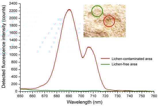 A lichen-contaminated fragment of one such sample and corresponding fluorescence signature of the biofilm—comprising two characteristic peaks at ca. 690 and 707 nm—are shown in Figure 5. These peaks are typical of chlorophyll a fluorescence. The main peak at ca. 690 nm represents the commonly observed fluorescence emission of chlorophyll a in the red region, whereas the secondary peak found at ca. 707 nm represents a shift of the typical emission of chlorophyll fluorescence in the far-red region of the spectrum []. In higher plants, the far-red fluorescence emission peak is circa 740 nm, but there are interspecific variations. In Arabidopsis thaliana the peak was reported at 726.9 nm [] and in sunflower at 725.4 nm. However, nitrogen starvation caused a marked downshift of this peak to 716.4 nm [], showing that the position of the in vivo fluorescence emission peak is not only species dependent, but also related to the environmental conditions. The shift of the in vivo chlorophyll fluorescence emission peaks may be due to changes in the amount of chlorophyll, alterations of the tissues’ geometry and the presence of other chromophores (e.g., anthocyanins). Lichens are symbiotic associations of algae and fungi and therefore are able to produce uncommon pigments such as parietin and melanin [] which may contribute to the shift of in vivo chlorophyll fluorescence emission peaks.