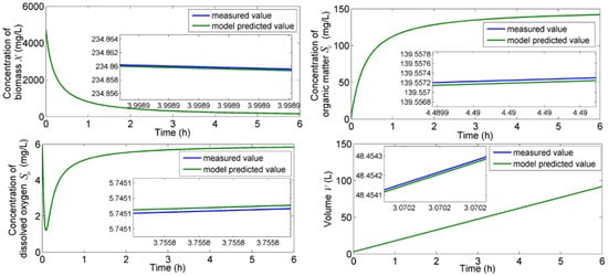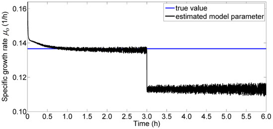 In the fault-free scenario, the simulated measured values and model predicted values for concentrations were obtained using the model parameters listed in Table 1 with initial values, mg/L, mg/L, mg/L, and L; the state profiles thus obtained are shown in Figure 2. In this system, noise was added as random data to evaluate the effectiveness of the proposed method. The estimated model parameters, , , and , were calculated using Equations (39)–(41) with step size, h and are shown in Figure 3. The result shows that the estimated model parameter is close to true model parameters. The diagnosis of fault was carried out by monitoring value of the residual value of model parameters and is shown in Figure 4. For each parameter no fault was detected as the residual was less than the threshold. The threshold was chosen as 10% from the nominal value. These results indicate that the technique proposed in this work can accurately estimate the model parameters, and this was achieved by carrying out simple function evaluations that alleviate the computational burden required for online implementation.