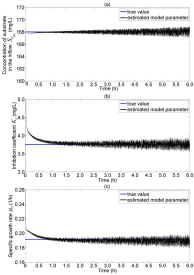 Estimated model parameters value for the fault-free scenario. (a) Concentration of substrate in the inflow, ; (b) inhibition coefficient, ; and (c) specific growth rate, .