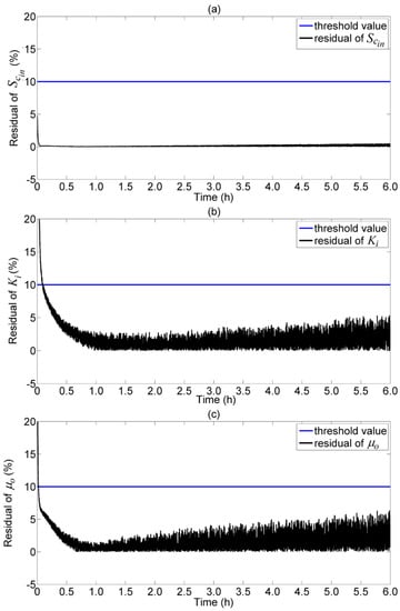 Residual of estimated model parameters for the fault-free scenario. (a) Concentration of substrate in the inflow, ; (b) inhibition coefficient, ; and (c) specific growth rate, .