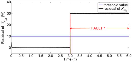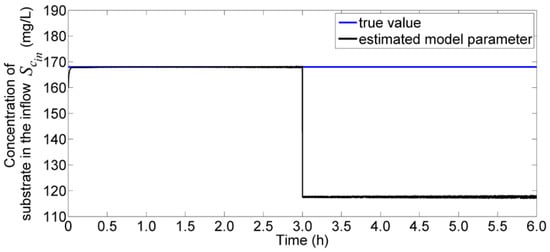 Investigation for the faulty scenarios was implemented where three faulty scenarios have been considered, where the percentage of change kinetic parameters is given in Table 2. In this case study, single fault was assumed to occur at any time. The step size was given as h. For faulty scenario 1, the estimated concentration of substrate in the inflow is shown in Figure 5. We can see that the estimated parameter decreased from 168 mg/L to 118 mg/L after 3 h. The residual of was monitored for fault detection, and is shown in Figure 6. This figure shows that the fault was declared at 3 h as the residual was more than a threshold value of 10%. For faulty scenario 2, the estimated half saturation coefficient, , is shown in Figure 7. We can see that the estimated parameter increased from 3.753 mg/L to 4.878 mg/L after 3 h and the residual of was monitored for fault detection. Figure 8 shows that after 3 h, the residual of was more than 10% of threshold and therefore, the fault was declared at 3 h. Figure 9 shows the estimated parameter for where the estimated model parameter was decreased from 0.1916 1/h to 0.1341 1/h. The fault detection was monitored using residual, and the result is shown in Figure 10. The residual of increased to 30% and indicates that faulty scenario 3 occurred at 3 h. These results indicate that there were faults at specified scenarios, and provided quick and accurate fault detection using explicit parametric functions.