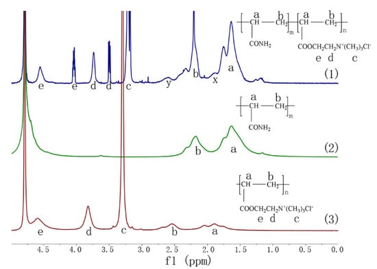 Proton nuclear magnetic resonance (1H NMR) spectra of (1) NP, (2) poly acrylamide (PAM), and (3) poly (acryloxyethyltrimethyl ammonium chloride) (PDAC).