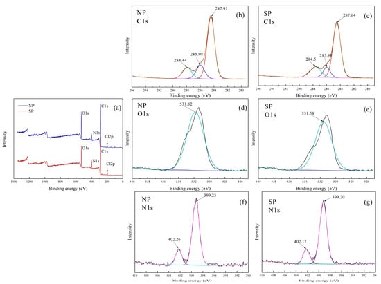 X-ray photoelectron spectroscope (XPS) (a) fully-scanned spectra; C 1s spectra of (b) NP and (c) SP; O 1s spectra of (d) NP and (e) SP; and N 1s spectra of (f) NP and (g) SP.