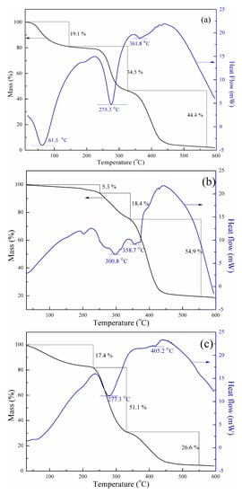 The TGA-DSC was conducted with a DTG-60H synchronal thermal analyzer (Shimadzu, Kyoto, Japan) at a heating rate, a nitrogen flow rate, and a temperature range of 10 °C/min, 20 mL/min, and 20 °C–600 °C, respectively.