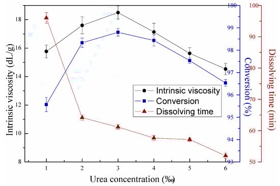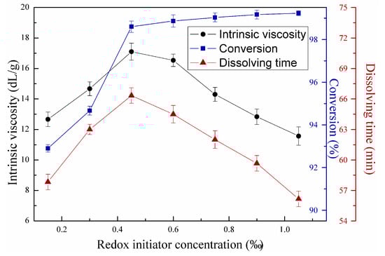 Figure 10 illustrates the effects of urea concentration, where the redox initiator, azo initiator, first-stage light intensity, second-stage light intensity, and mass ratio between AM and DAC reached 0.45 wt‰, 0.2 wt‰, 7 mW/cm2, 14.5 mW/cm2, and 6:4, respectively. As mentioned above, short dissolving time will facilitate the actual CPAM application. However, significant differences in size and velocity between the water and polymer inhibited water to seep in the polymer molecular chain of the copolymer solution. Urea can weaken hydrogen bonding between the side groups of CPAM molecular chain, resulting in the decreased intermolecular forces and chance of crosslinking. Therefore, urea was used as solubilizer in polymerization to reduce the dissolving time. Despite the decreased dissolving time with increased urea concentration, urea influenced intrinsic viscosity. This condition was observed as urea acted as a reducing agent to increase the kinetic chain length, and this effect can be observed when urea concentration measured below 3‰. However, the negative effect of urea is that it can transfer growing chains to cause radical termination, thus decreasing intrinsic viscosity and conversion [,]. In the present study, the optimum urea concentration reached 3 wt‰.