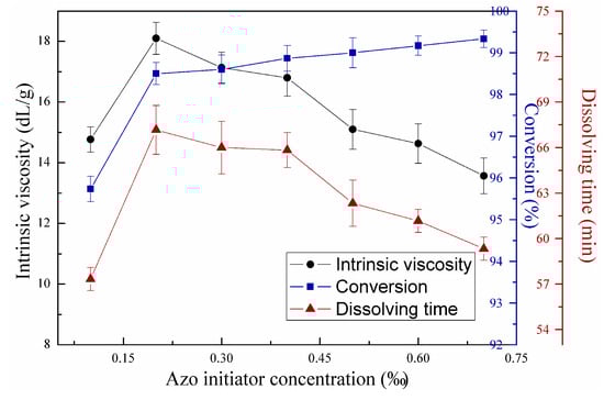 Figure 7 illustrates the effects of redox initiator concentration on copolymerization using first-stage light intensity of 7 mW/cm2, second-stage light intensity of 14.5 mW/cm2, mass ratio between AM and DAC of 7:3, urea concentration of 2 wt‰, and azo initiator concentration of 0.3 wt‰. Figure 8 shows the effects of azo initiator concentration on copolymerization under the same reaction conditions in Figure 7, except that redox initiator concentration equaled 0.45 wt‰. Copolymer intrinsic viscosity and dissolving time increased with increasing initiator concentration after reaching maximum at redox initiator of 0.45 wt‰ and azo initiator concentration of 0.2 wt‰, but decreased with further increase in initiator concentration based on Figure 7 and Figure 8. Conversion continually increased in the entire initiator concentration range, featuring a notable decreasing speed. Seabrook et al. proved that classical free-classical polymerization kinetics provides an acceptable quantitative description for photo-initiated polymerization of AM in water []. This phenomenon occurs due to the complex formation, cage effect, or primary radical termination with macro-radicals. When the redox or azo initiator concentrations were insufficient, the cage effect may lead to low polymer yields and low intrinsic viscosity due to the predominating termination of growing chains inside the cage as few monomer units contributed to propagation. Considerable primary radicals escaped from their “cages” to react with monomers, leading to the continuous growth of molecular chain with increasing initiator concentrations. In these conditions, conversion also increased remarkably. However, chain termination and transfer will occur more easily with increasing redox initiator concentration above 0.45 wt‰ and azo initiator concentration above 0.2 wt‰ as radical concentration in the polymerization system increased []. This trend accorded well with the classical kinetic theory, which predicts that kinetic chain length depends on the square root of initiator concentration. Additionally, monomers still feature high chances to convert into copolymers with the numerous produced radicals. The gel effect hampered the increase in monomers without limitation [].