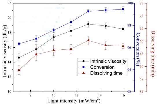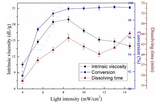 As shown in Figure 12, the curves showed similar trends with those in Figure 11. Intrinsic viscosity and dissolving time increased and decreased with increasing second-stage light intensity, and conversion followed a continuously increasing trend. The highest intrinsic viscosity was observed at second-stage light intensity of 13 mW/cm2. However, differences were observed between the two figures. First, in Figure 12, no vast decreasing range was observed in intrinsic viscosity after reaching the maximum. Second, the dissolving time still correlated well with intrinsic viscosity although light intensity was higher than 13 mW/cm2, indicating that the copolymer was not cross-linked at such condition. Different polymerization stages caused the above differences. The increasing second-stage light intensity below 13 mW/cm2 contributed to high conversion and increase in intrinsic viscosity. However, after the first-stage UVA illumination, a certain number of monomers were reacted, and a semi-solid or solid product can be produced, i.e., the polymer chains were not in aqueous solution state. The radical concentration at the middle or last phase will not reach as high as that in the initial phase with the same light intensity given that radical concentration is influenced by monomer concentration. And the semi-solid or solid state of the product may also inhibit cross-linking []. As mentioned above, chain termination and transfer rate were directly affected by radical concentration. Therefore, intrinsic viscosity was less influenced by increasing light intensity above 13 mW/cm2, and molecular chain cross-linking was also less likely to occur.