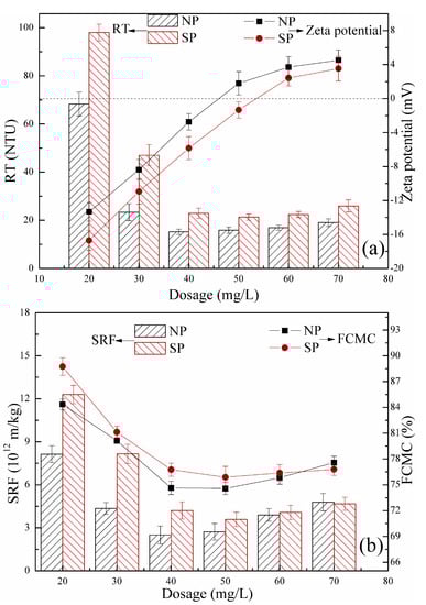 The conditioning efficiency of flocculants is significantly influenced by flocculant dosage. Turbidity is widely used to explain the performance of a polymer sample in various flocculation fields because it indicates the content of suspended particles in the liquid phase. The index of FCMC is an important aspect to be considered in compressible sludge dewatering. High FCMC is not desirable because it results in large sludge volumes that increase the following treatment costs. The index of SRF is widely used to evaluate sludge filtration performance, and small SRF reflects a good performance in sludge dewatering. Zeta potential plays an important role in analyzing the charge interactions between the polyelectrolyte and oppositely charged particles []. Figure 13 shows the effect of NP and SP dosages on RT, zeta potential, FCMC, and SRF. Clear solid-liquid separation was achieved when the dosage was higher than 40 mg/L for NP and SP, as shown in Figure 13a. This result corresponded well with that of FCMC and SRF, as shown in Figure 13b. Such experimental results indicated that the optimum dosage was 40 mg/L for the two polyelectrolytes. Lower RT, FCMC, and SRF ratios of NP was observed than that of SP. A good sludge conditioning performance of NP was obtained, and this condition was closely related to CD, intrinsic viscosity, and morphological porous structure.