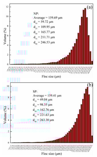 To examine the effects of the novel UVA initiation system on flocculant sludge conditioning mechanisms, floc characteristics, such as settling behavior and floc size distribution with NP and SP, were comparatively investigated. Figure 14 plots the settling rate of sludge as expressed in terms of the height of the sludge-water interface as a function of time at a dosage of 40 mg/L flocculants. In this study, the rate of variation in the sludge-water interfacial height over 5 min was assumed to be the sludge sedimentation rate. The settling rates reached 4.0 and 3.7 cm/min for the sludge conditioned with NP and SP, respectively. An improved settling capability of NP could be observed. At the end of settling, NP and SP had similar heights of 14.4 and 14.7 cm, respectively. These findings indicated the similar floc sizes of sludge particles conditioned by NP and SP. Nearly the same average floc size of the two polyelectrolytes could be estimated (Figure 15). These different settling behaviors might be attributed to floc density and size distribution. In Figure 15, d10 and d25 of NP were higher than those of SP, indicating that less small floc particles existed in NP-conditioned sludge. Few small particles favor sludge dewatering because a cloth filter is less likely to be clogged [], implying the low SRF of NP (Figure 13). However, d75 and d90 of NP were smaller than those of SP. Bridging plays an important role in sludge conditioning for SP because the bridging mechanism is constantly characterized by a large floc size []. Nevertheless, a large floc size could be disadvantageous for sludge dewatering. Large and loose flocs with a high content of intrafloc water (water from within the floc, comprising loops and tails) [], which is not easily removed during filtration, were formed, and this phenomenon corresponded well with the high FCMC of SP (Figure 13).