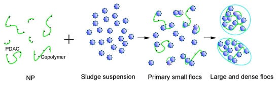 The different initiation systems included the origin of different sludge conditioning performances and mechanisms. Figure 16 shows the sludge flocculation scheme of NP. In Figure 3, several fractions of PDAC existed in NP. After NP was added, the sludge particles were neutralized and destabilized with the existence of PDAC and copolymers. Under this condition, the main flocculation mechanism was charge neutralization, given that the strength between charged sites is higher than Van der Waals force or hydrogen bonds []. Flocs are assumed to form through charge neutralization and characterized by compactness and low intrafloc water. However, numerous negative sites were still found on sludge particles because the zeta potential was lower than 0 mV at 40 mg/L (Figure 13a). Bridging became the main flocculation mechanism to form large and dense sludge flocs through Van der Waals force, hydrogen bonds, or electrical force. This condition might explain the floc size distribution and sludge conditioning performance of NP. By contrast, in the single initiator and stable light intensity systems, DAC monomers reacted insufficiently, the first step of charge neutralization could not function well, and bridging served as the main mechanism during flocculation. We observed that flocs mainly formed through bridging were loose and featured a wide range of floc size distribution and a high percent of intrafloc water. Therefore, the sludge conditioning performance of SP was poorer than that of NP.