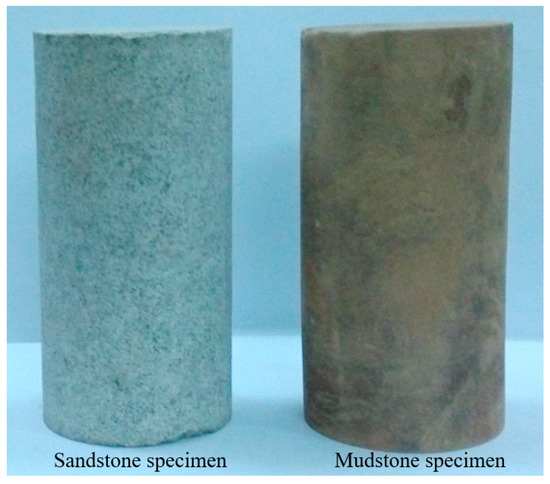 The test materials in this study came from Chongqing Jiaotong University, Chongqing city, China. The selected sandstone and mudstone were formed in Mesozoic, and the colors were fresh gray and aubergine, respectively. According to ISRM [24], specimen processing was conducted as follows: Initially, the sandstone and mudstone cylinders were obtained from the rock mass by drilling cores; later, the cylinders were made into pieces of size 50 mm in diameter and 100 mm in thickness (Figure 1). The initial water content (w), natural density (ρn) and dry density (ρd) of the sandstone specimens are 1.41%, 2.46 g/cm3, and 2.43 g/cm3, respectively. The w, ρn and ρd of the mudstone specimens are 1.75%, 2.42 g/cm3, and 2.37 g/cm3, respectively. Before testing, the specimens were stored in dry conditions with a temperature of 20 °C.