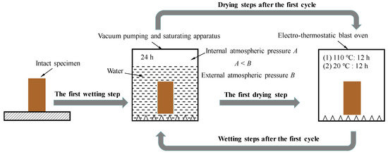 In the WDUCT, the selected specimens were submerged in water for 24 h firstly, then these specimens were then dried in an electro-thermostatic blast oven at 110 °C for 12 h. Later, they were cooled to temperature of 20 °C for 12 h. The whole process is regarded as a single wetting-drying cycle (see Figure 2).